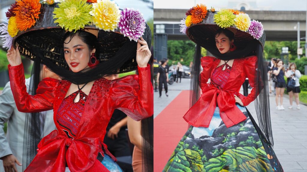 Nông Thuý Hằng khoe vẻ đẹp sắc sảo khi diện thiết kế lấy cảm hứng từ ruộng bậc thang vùng cao Y Tý (Lào Cai).